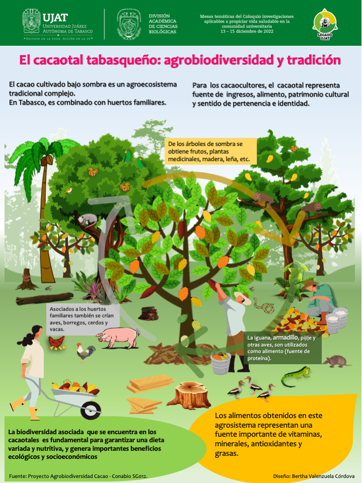 El agrosistema de cacao cultivado bajo sombra es un sistema tradicional complejo. Los componentes de la agrobiodiversidad son de importancia para la alimentación y la agricultura local, producción de bienes y servicios, y son parte fundamental del patrimonio biocultural en Tabasco. Es un cultivo con arraigo en las costumbres, gastronomía y comercio local. En el presente trabajo se presentan resultados preliminares de una encuesta sobre agrobiodiversidad y servicios ecosistémicos a 120 productores de cacao. Los resultados forman parte del proyecto “El agrosistema cacao como Patrimonio Biocultural de Tabasco y su resiliencia ante el Cambio Global”. Entre las plantas que son usadas como alimento mencionaron árboles frutales, palmas, cultivos de ciclo corto y bianules, y especias. Estos representan una fuente importante de vitaminas, minerales, antioxidantes y grasas para los productores y sus familias. Como fuente de proteína animal crían aves de corral, borregos, cerdos y vacas, además de fauna silvestre como iguana, armadillo, pijije y otras aves.