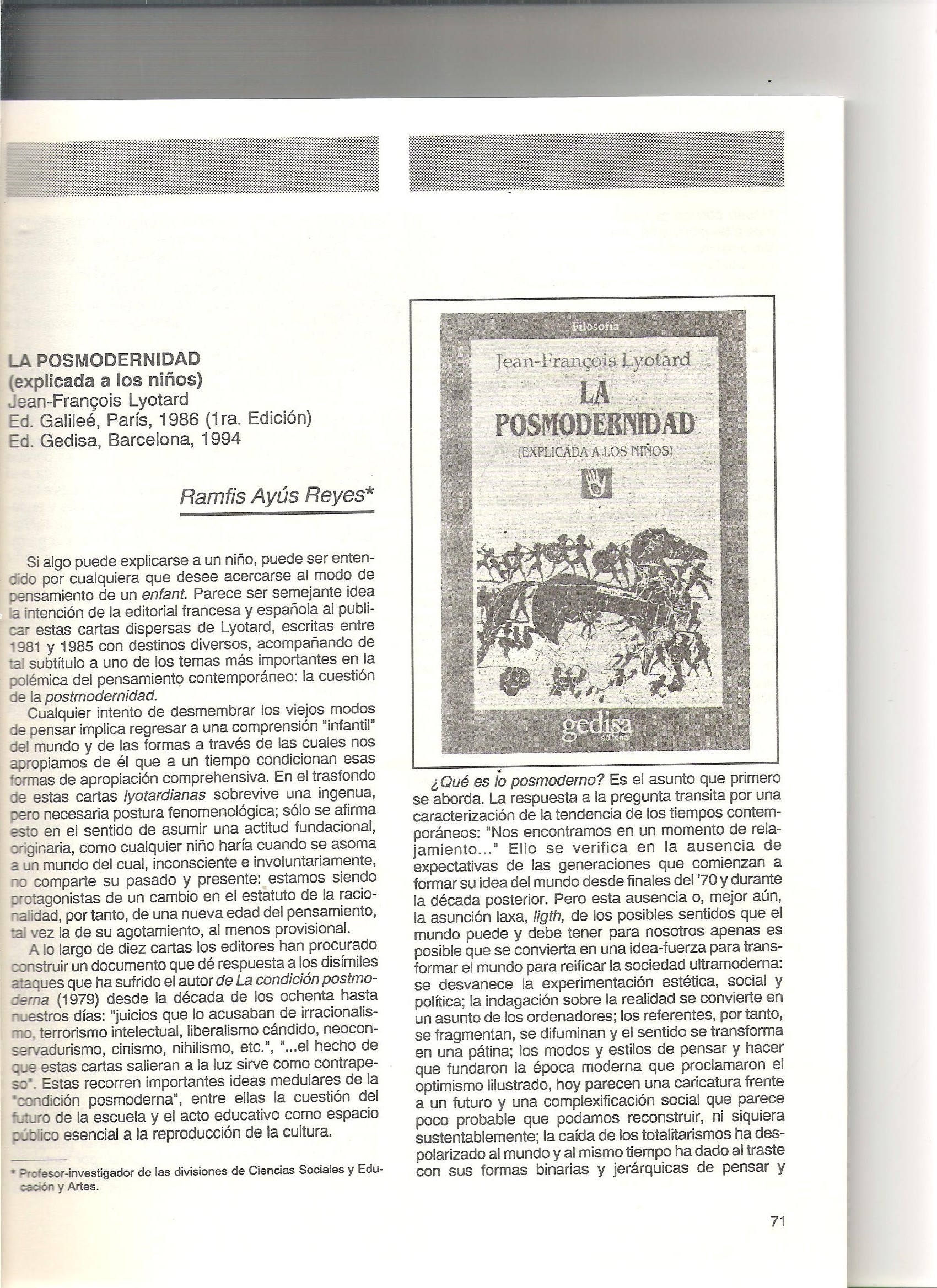 Si algo puede explicarse a un niño, puede ser entendido por cualquiera que desee acercarse al modo de pensamiento de un . Parece ser semejante idea la intención editorial francesa y española al publicar estas cartas dispersas de Lyotard, escritas entre 1981 y 1985 con destinos diversos, acompañando de tal subtitulo a uno de los temas más importantes en la polémica del pensamiento contemporáneo: la cuestión de la postmodernidad Para obtener el artículo completo pueden contactar al Editor de la Revista Perspectivas docentes en el siguiente correo electrónico perspectivas.dese@ujat.mx.
