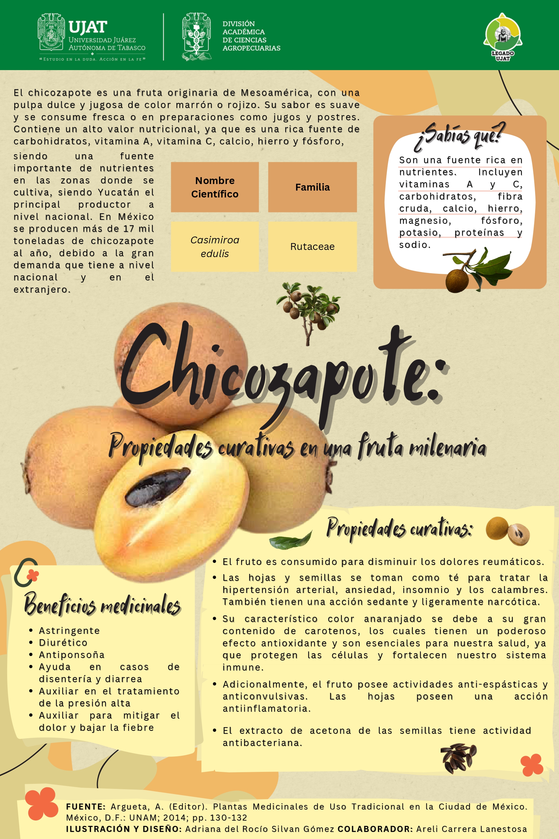 El chicozapote es una fruta originaria de Mesoamérica, con una pulpa dulce y jugosa de color marrón o rojizo. Su sabor es suave y se consume fresca o en preparaciones como jugos y postres. Posee un alto valor nutricional, ya que es una rica fuente de carbohidratos, vitamina A, vitamina C, calcio, hierro y fósforo, siendo una fuente importante de nutrientes en las zonas dónde se cultiva, siéndonosla Yucatán el primer productor en México.