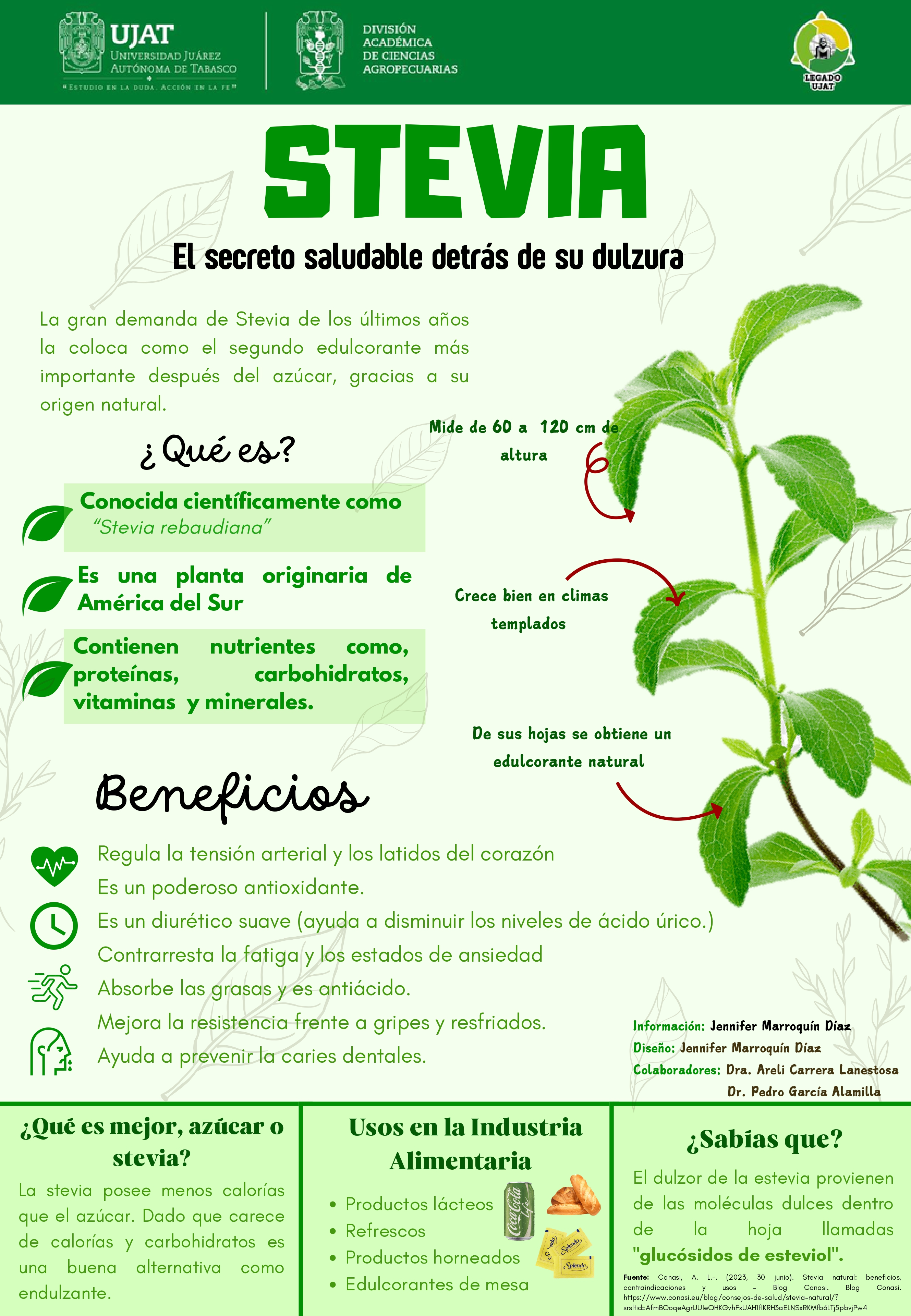 La gran demanda de Stevia de los últimos años la coloca como el segundo edulcorante más importante después del azúcar, gracias a su origen natural. Regula la tensión arterial y los latidos del corazón Es un poderoso antioxidante. Es un diurético suave (ayuda a disminuir los niveles de ácido úrico. Contrarresta la fatiga y los estados de ansiedad. Absorbe las grasas y es antiácido. Mejora la resistencia frente a gripes y resfriados. Ayuda a prevenir la caries dentales.