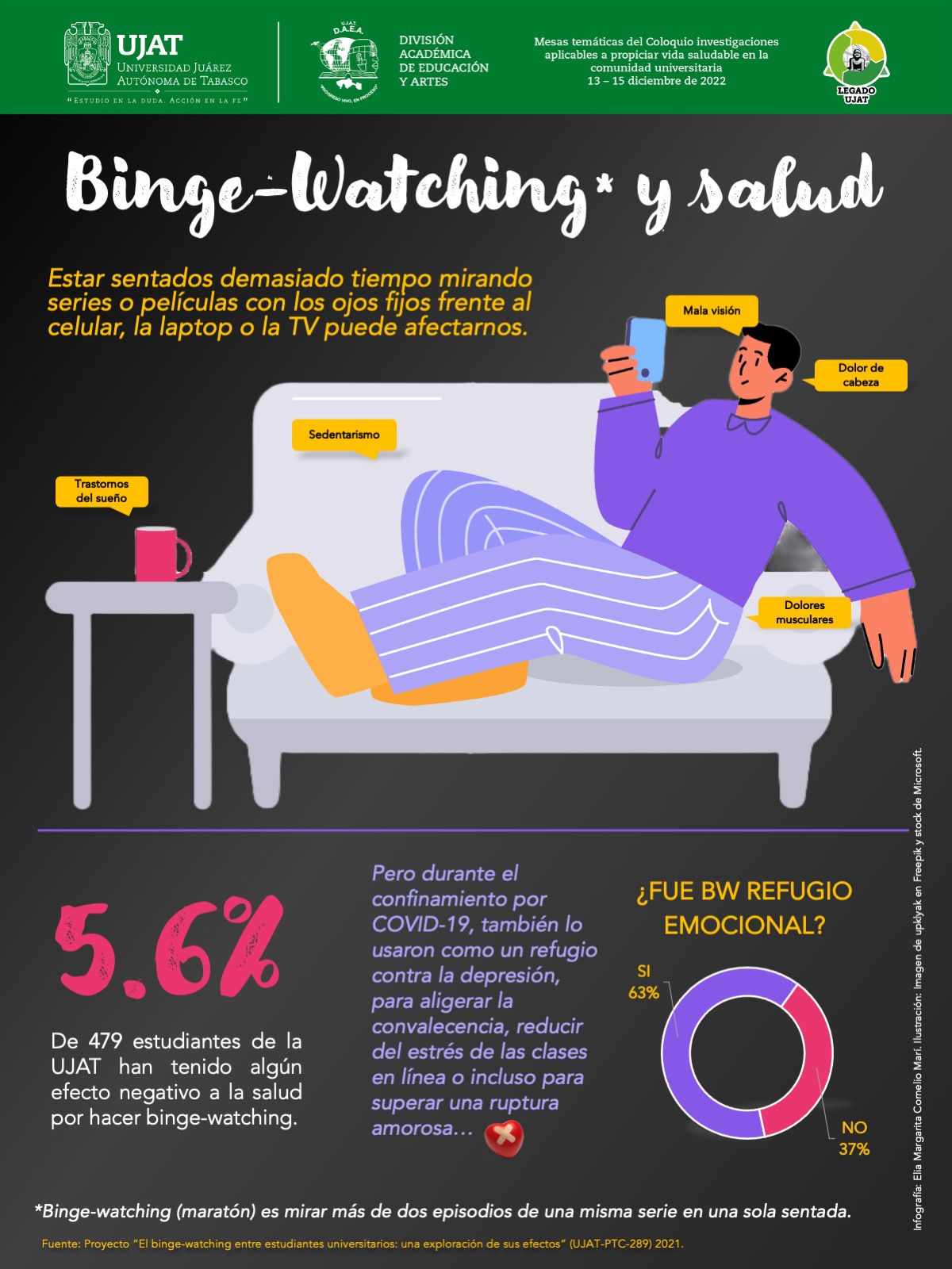 Infografía sobre aspectos relacionados con la práctica del binge-watching (mirar maratones de televisión) y la salud de los estudiantes universitarios de la UJAT. La infografía es resultado del proyecto de investigación UJAT-PTC289 financiado por PRODEP y realizado en 2021.